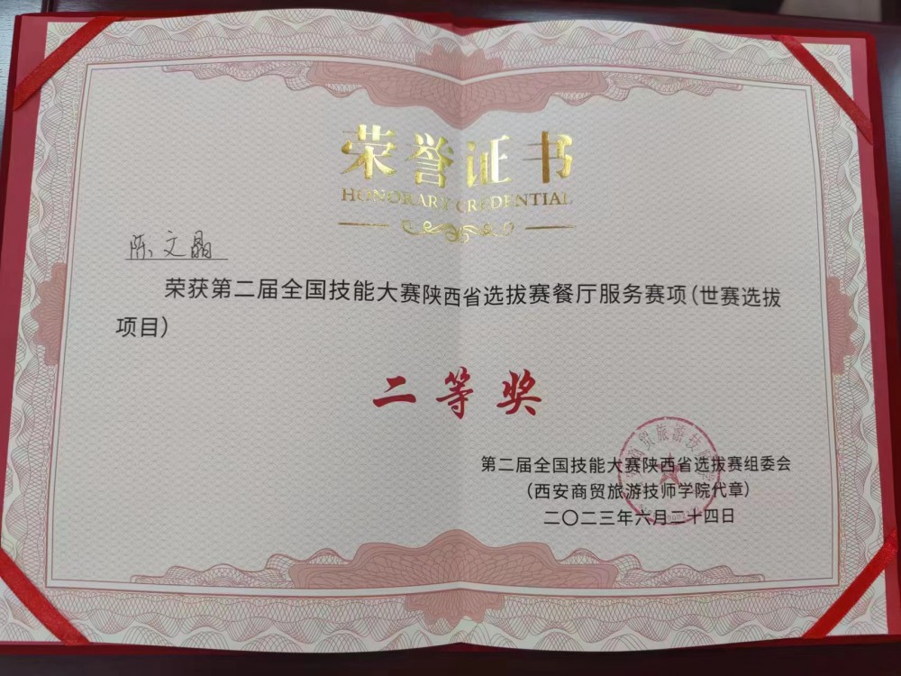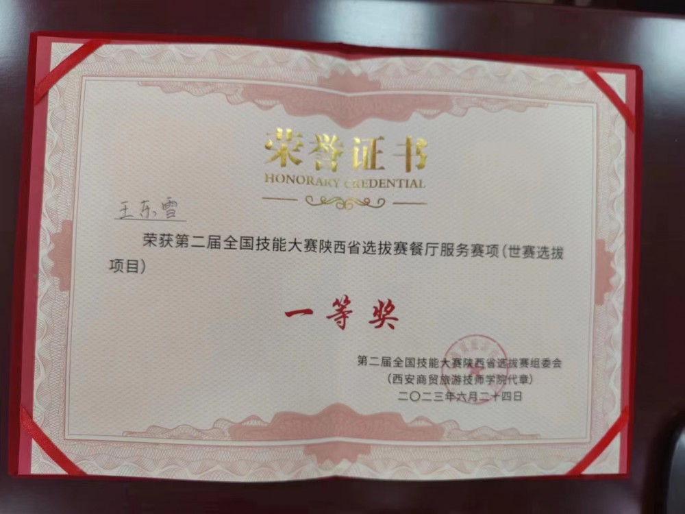 祝贺beat365官网酒旅221班王东雪同学荣获第47届世赛选拔赛餐厅服务项目陕西选拔赛一等奖,酒旅221班陈文晶同学荣获世赛选拔赛餐厅服务项目陕西选拔赛二等奖