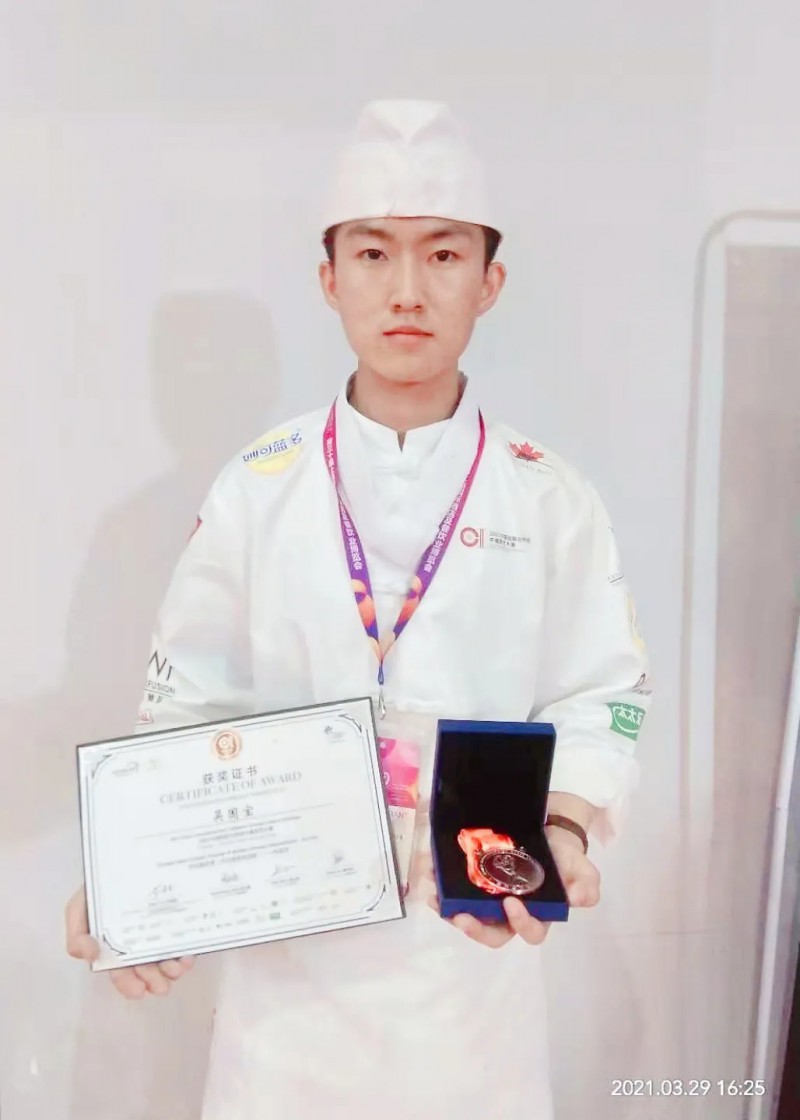 嗯嗯。小吴同学在生活中也是离不开烹饪呢。我知道你在2021中国创新与传统中餐厨艺大赛中获得了中式融合菜——热菜项的铜奖,有好多学弟学妹们想认识你,跟你学习一些参赛的经验,你能跟大家谈谈吗?