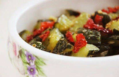 4.煎到黄瓜花刀的地方焦焦的,没有皮向上的一面看上去软软的,放入蒜,紫苏,干辣椒,盐;
