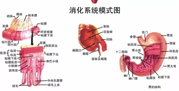 消化系统是以从口腔(前门)到肛门(后门)的一条消化通道及唾液腺、胃腺、肠腺、肝脏、胰腺等附属消化器官组成。消化道包括口腔、食道、胃、小肠(十二指肠、空肠、回肠)、大肠(肓肠、结肠、直肠)、肛门。