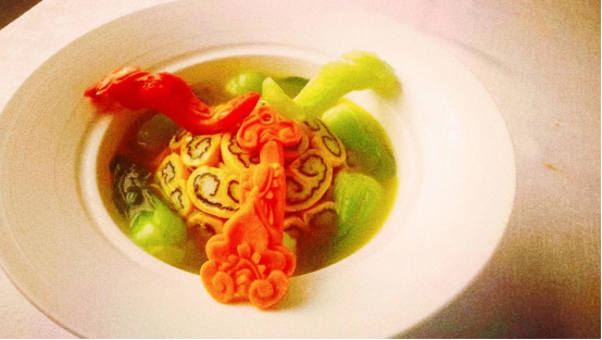 7. 气化万物:张载认为,“气”或“元气”是人和万物产生的最高体系和最初始基。这“一气”或“元气”,包含了阴阳二气的对立依存,相反相成,升降互变的关系,在这种关系的交互运动中产生了人和万物。将冬瓜或者苹果切片,粘裹上脆浆,入油炸制高鼓膨酥即可,寓意气化万物。