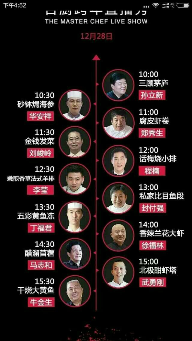 《百厨跨年直播秀》在邀请的100名厨师中,既有像郑秀生(北京饭店前行政总厨)、孙立新(便宜坊集团副总经理、行政总厨)、侯玉瑞(人力资源和社会保障部教育培训中心技能开发处处长)、牛金生(中国著名的烹饪大师)、马志和(北京鸿云楼行政总厨)、徐福林(全聚德烤鸭店前门店行政总厨)、申建国(北京玉华台饭庄行政总厨)、冯怀申(中国烹饪大师老北京烧饼非遗传承人)等国宝级的老一辈烹饪大师;也有像封付强(狗不理集团行政总厨)、武勇刚(北京皇家大饭店行政总厨)、徐萌(西餐协会副秘书长)等一批烹饪界经验丰富的中间力量;更有像王昊(希尔顿酒店行政总厨、厨王争霸洛杉矶站总冠军)、李莹(美国驻华大使馆前主厨、新西兰厨师交流协会主席)等国际顶尖级的后起之秀。在表演的菜品中,既有中国各个地域流派的川、粤、鲁、扬、苏、闽、湘、陕菜等地方特色美味,也有俄、法、美、英、土耳其的异域风味佳肴;既有“师古”的传统美味,也有“开新”的新颖肴馔。可谓是:集京华厨师于一堂,荟四海美味于一屏。