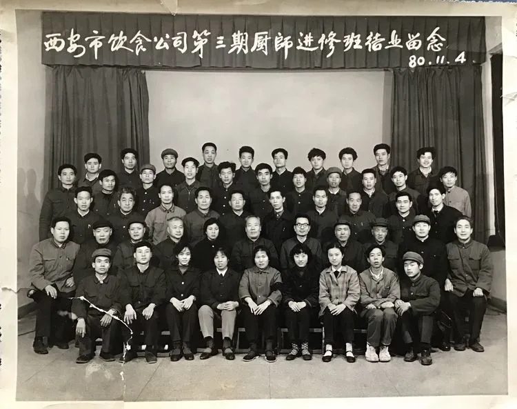 其实,在西安市饮食公司举办这三期烹饪技术培训班以前,已经有过类似第一期烹饪培训班那样的厨师培训经历和过程了。据当事人西安市饮食公司退休老职工李泉和赵俊二位老师夫付回忆说,当时由西安市饮食公司举办的厨师培训班,是专门定向给中央代培烹饪技术人才的。这期为国家代理培训厨师的培训班是由1964年开学举办的,计划学习培训期是三年,学员全部是由西安市饮食公司在其管辖的各个区饮食公司基层饭店抽调来的在职操作人员,年龄都在20岁左右,大约有50余名学员。当时学校的地址设在南院门春发生葫芦头对面的大芳照相馆的二楼。这批学员当中走向公司级领导岗位的有毕海生,刘龙宇;在基层饭店担任领导职务的有朱敦义,祝乾生,杨百顺,王恒,马宝联,李广义,孙喜忠,张保金,李素卿(女),刘红,马文艺,李德敏,李泉,严家保等。当时的班主任是西安市饮食公司的业务干部夏庭玉,语文和音乐老师是新入职的大学生马丽(女)担任,烹饪技术专业课是由五一饭店的罗文涛、魏九江、东亚饭店的孙寄生、西安饭庄的曹秉均、和平餐厅的李生荣、韩忠俭等业内的老师傅担任。培训模式是一周集中上课一天,其余时间分别在各自的饭店里实习或统一分组到定点饭店去实习。统一定点分组实习时,是由烹饪技术操作授课的老师带领大家轮流在东郊的纺织城商场、韩森寨商场,南郊的小寨商场,西郊的土门商场和桃园商场里的对外经营的餐厅里以对外经营的模式住店定点实习。这样安排的目的,一是为了提高和巩固学员在学校学习菜品,二是为了改善和丰富商场周围厂矿企业群众的饮食生活服务。在1964年底时又承接了为中央再定向代培17名厨师的任务。这样西安饮食公司当时就有了两个厨师代培班,即:中央代培甲班(指原来的班)和中央代培乙班(指新班)。中央代培乙班共计有17名学员,他们定向招来后,先期集中在西安市饮食公司的直属的国营一食堂9个人(后来的五一饭店),有孙茂林、张承振、王好印、候小虎、贠砚、赵俊、李福林、武文建、薛东鑫。国营二食堂8个人(后来的和平餐厅),有柏万国、张群朝、何大鹏(后改名何铁蛋)、李继全、张金相、张孝仁、张庆海、郝连江。后来因为文化大革命的原因,他们这二个代训班的学员都没有按约成行。但是,这些人按照中央用人的要求,统一经过专业、系统、正规的培训后,烹饪业务技术得到大幅度提高,大多数都成为了西安餐饮行业的一代枭雄,成为各个餐厅饭店的中流砥柱。深感遗憾的是没有收集到他们在那个时期、那件事情、那段过程中的相关资料,不能为大家还原那段令人肃然起敬的培训场景了。