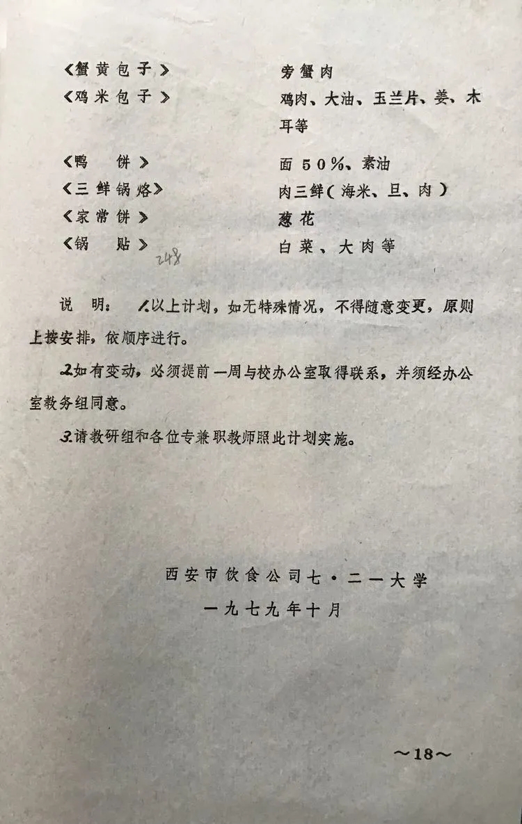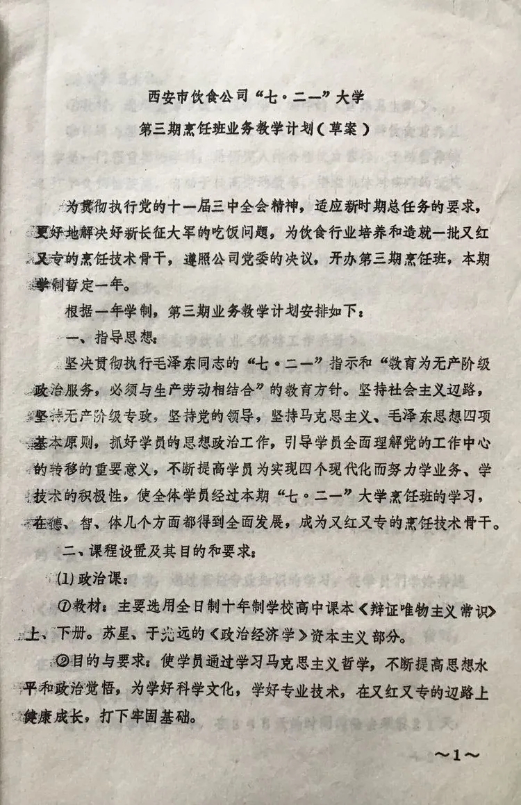 从1976年第一期烹饪培训班的学员不到20人,到1978年第二期烹饪的约50人(不含小吃班),再到1979年第三期的定额31人;从第一期烹饪培训班的教学计划只是一张纸的课表形式,到第二期有了九张纸的具体内容,再到第三期既有七页内容培训班的安排意见,又有十八页烹饪班详细业务教学计划;从第一期的培训时间1年,到第二期的六个月,又到第三期的1年;从第一期结业到第二期开学其间间隔时间为2年,到第二期结业至第三期开学其间间隔不到1年;从第一期烹饪班的授课老师20位(孙国庆、靳宣敏、许再喜、尚长青、韩忠俭、唐延生、章柴祖、韩生域、李风藻、安振邦、李玉田、朱子明、马振贤、徐顺发、于映文、刘荩臣、倪栓齐、李致忠、李荣春、张鸿儒。公司系统外2位),到第二期烹饪班的授课老师18位(席志华、尚长青、孙国庆、白有信、于映文、郭家金、费平安、倪栓齐、韩忠俭、许再喜、尚长青、邓省齐、韩生域、李致忠、靳宣敏、唐延生、许伯泉、翟耀民),再到第三期烹饪班的授课老师17位的变化(靳宣敏、邓省齐、韩忠俭、翟耀民、于映文、倪栓齐、唐延生、郭家金、许再喜、许伯泉、孙国庆、尚长青、韩生域、费平安、白有信、翟耀民、李致忠、李玉田);从第一期烹饪班带面点课(授课老师朱子明、李玉田),到第二期烹饪班不带面点课而开设专职面点班,再到第三期烹饪班又带面点课(授课老师李玉田);从第一期、第二期烹饪实践操作课计划只有授课老师、没有授课菜点名称,到第三期烹饪实践操作教学课每位授课老师的菜品全部列入计划安民告示;……。这里面有着太多的变数与不同。也正如后来人们总结这三期烹饪培训班时所说的那样:第一期的烹饪培训班是摸着石头过河——探路;第二期的烹饪培训班是总结完善——开路;第三期烹饪培训班是初具雏形——成路。特别是由第三期烹饪培训班开始了抽调启用让有文化、会操作、懂理论的年轻学员留校任教的模式,使传统的烹饪教育和厨师培训活动顿时变得灵动活跃起来,一改过去老师傅兼讲烹饪理论课时那种“满肚子蝴蝶飞不出来”的尴尬现象,逐步开始真正的实现了烹饪技艺教学过程中理论与实践的完美结合。这就是后来的西安桃李旅游烹饪学院在二十世纪七十年代时孕育、诞生、成长、发展的进化提升过程。再就是“西安市饮食公司七.二一大学关于开办第三期烹饪班的安排意见”后面盖印的《西安市饮食公司革命委员会七二一工人大学》那枚鲜红的印章,可谓真是难得罕见的“见证历史事件奇迹”的原始物件了。