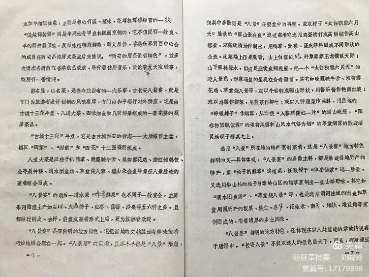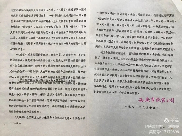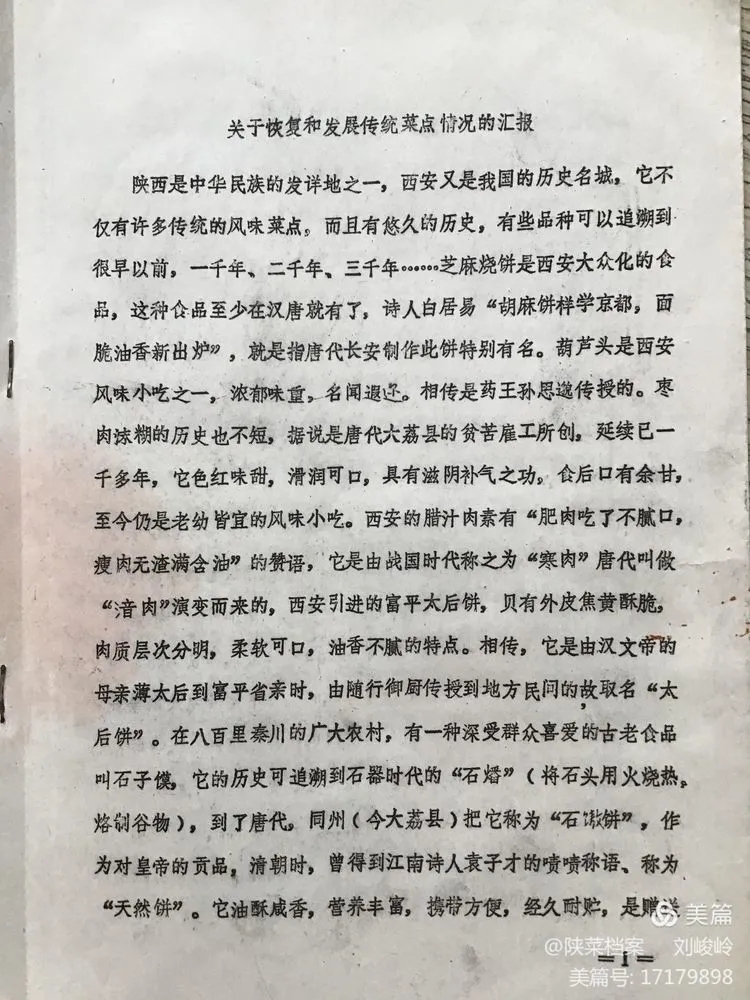 这份《关于恢复和发展传统菜点情况的汇报》材料,是西安市饮食公司于一九八三年八月十九日印发的,一共9页不到5000字。由于没有注明具体的呈报单位,所以无法知道它当时的真实用途。但是,如果仔细的阅读完它的全部内容,再结合当时西安餐饮行业的时代背景和后来发展的情况,就会知道这份资料在陕菜历史进程中承前启后的历史功绩。
