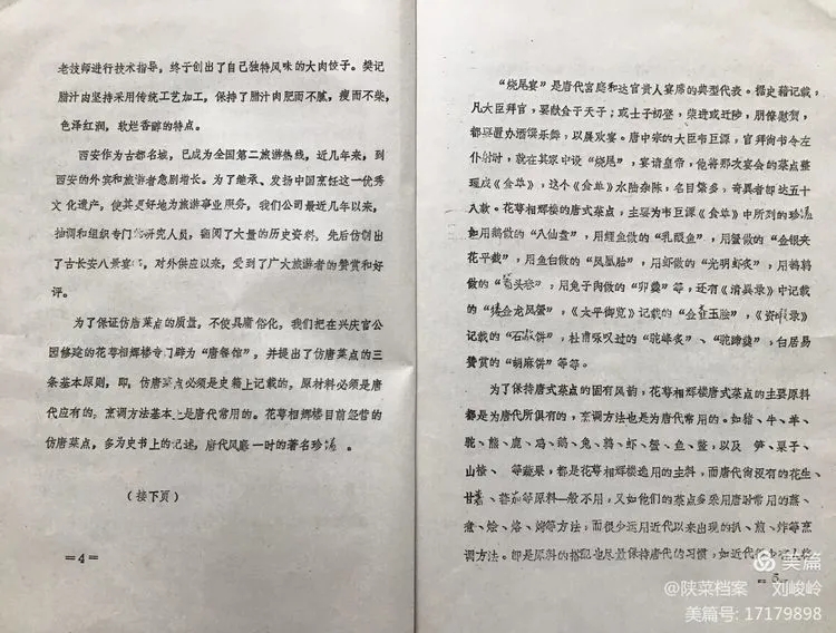 在谈到西安餐饮当时的业态时是这样说:“陕西传统菜点与全国的情况大致一样,建国以后的五十年代初期,曾有过较快的发展,但后来由于“左”的指导思想的影响,盲目并店,不注意保持风味特色,特别是十年动乱时期,传统风味菜点受到了严重的摧残。党的十一届三中全会以来,商业部和中国饮食服务公司先后在烟台、郑州召开了饮食工作座谈会,提出了饮食业“面向人民大众,分级划类经营,发扬传统特色,适应多种需要”的经营方针。根据会议精神,结合我市实际情况,我们开展了创名店、创名菜点、创优质品种的“三创”活动,经过努力,现在恢复的传统炒菜品种有415种(重复统计),面点87种,风味小吃52种。中、大型中餐馆每天供应的品种一般保证在25个品种以上,许多饭店还形成了一批风味特点突出的“看家菜”,如和平餐厅的烤乳猪、烧八素、燕菜卷;西安川菜馆的干烧鱼、鱼香肉丝、宫爆鸡丁;民生餐厅的炒鳝糊、炒锦片、香酥肉;桃李春饭店的蝴蝶海参、糖醋鱿鱼卷、三皮丝;西秦饭庄的带把肘子、温拌腰丝、蜜汁葫芦等风味品种。在开展“三创”活动中涌现出解放路饺子馆、樊记腊汁肉等一些名店、名菜点。解放路饺子馆在被评为全国贸易先进单位成名店后,又在饺子质量上进行研究,多次聘请老技师进行技术指导,终于创出了自己独特风味的大肉饺子。樊记腊汁肉坚持采用传统工艺加工,保持了腊汁肉肥而不腻,瘦而不柴,色泽红润,软烂香醇的特点。” 不长的叙述,就将新中国成立以来全国和西安餐饮业40余年的变化跃然纸上,可让人眼睛随着文字移动而有身临其境的感觉。