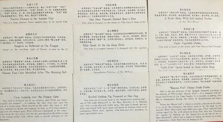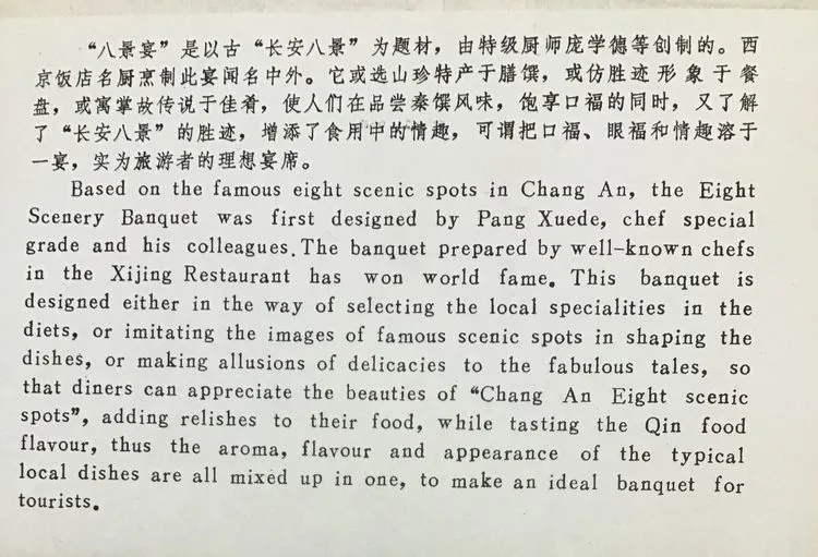 这套由王子辉编写、胡武功摄影、陕西人民美术出版社出版的类似明信片的《长安八景宴》小册子,一共有十二张图片,它向人们展示了《长安八景宴》这一桌菜肴的全部内容。正如小册子后面简介里说的那样:““长安八景宴”是以古“长安八景”为题材,由特级厨师庞学德等创制的。西京饭店名厨烹制此宴闻名中外。它或选山珍特产于膳馔,或仿胜迹形象于餐盘,或寓掌故传说于佳肴,使人们在品尝秦馔风味,饱享口福的同时,又了解了“长安八景”的胜迹,增添了食用中的情趣,可谓把口福、眼福和情趣溶于一宴,实为旅游者的理想宴席。” 介绍里说“”烹制此宴出名的《西京饭店》,不是原来西安市人民政府招待所的那个《西京饭店》,而是西安市饮食公司下属的《和平餐厅》。和平餐厅因在上世纪70年代末发生过一次枪杀事件,故在80年代初期曾更名《西京饭店》,后因和西安市人民政府的招待所同名,后又恢复《和平餐厅》店名。
