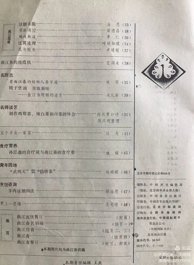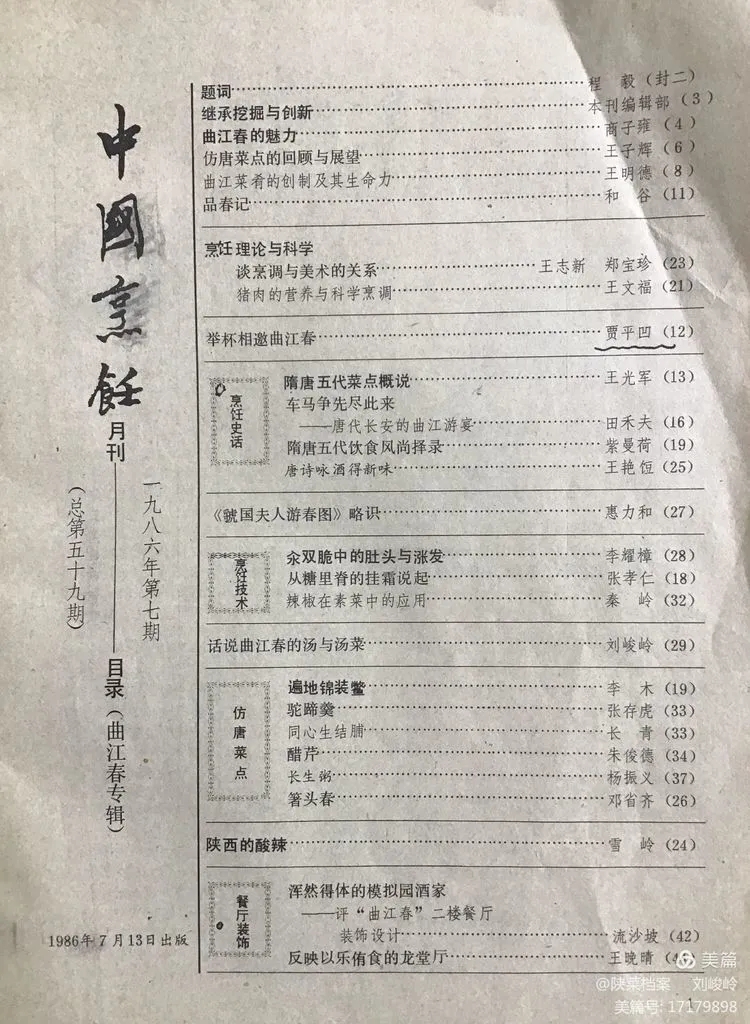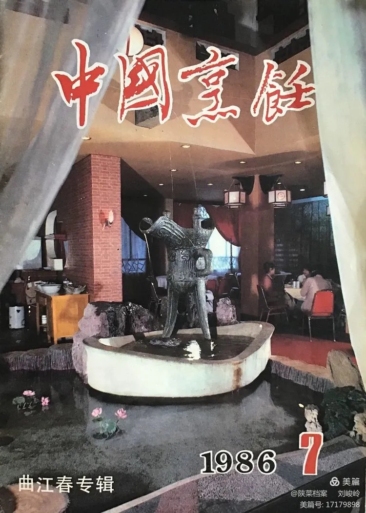 这本发行于1986年第7期的“曲江春”专辑的杂志,是《中国烹饪》杂志自1980年创刊以来,第一次破例专门为一个餐厅出版发行的一期专刊。而荣获这个特殊待遇的就是西安市的“曲江春酒家”。