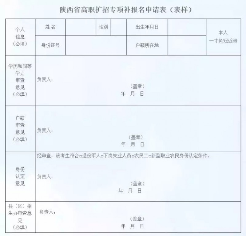 拟参加本次高职扩招专项补报名的考生,可于网上报名前,持本人二代居民身份证,前往户籍所在地县(区)招生办领取《高职扩招专项补报名申请表》