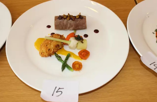 获奖者董昊,他获奖的菜是美国里脊肉火腿卷配樱桃汁。主要食材有美国里脊肉,火腿,蘑菇,松露等。