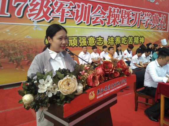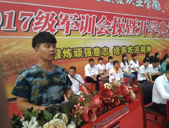 17级新生学生代表程泽国在发言中说,人生道路不会一帆风顺的,我们必须坚持目标,为梦想不懈努力,并表了决心,拿出“吹尽黄沙拾到金”的毅力,投入全新的学习中去。