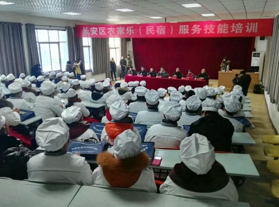 长安区截止2017年底,己发展“农家乐”1600余户,“农家乐”是长安区五大支柱产业之一,现有的农家乐经营模式滞后,经营理念,经营方式己远远落伍。为改进这一局面。中心与学院共谋大计,精心设置课程,区上拔专款专用进行产业调整,“做強农家乐”。在区扬庄街道选调39人,滦镇街道选调65人,由政府买单,免费为“农家乐”经营业主进行培训,走进大学课堂,接受专业知识学习。系统学习了“农家乐”十互联网十教育十名片的知识,了解“民宿”的发展历史,掌握“农家乐”经营之道——独家独院“吃、住、游、玩、购”一体化新理念。