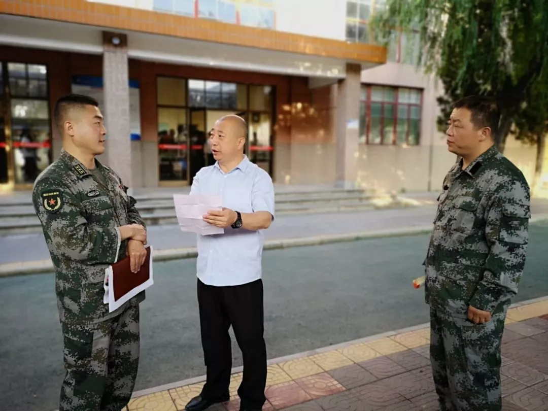 图为泾阳县人民武装部袁部长和副院长杨文利进行征兵工作交流