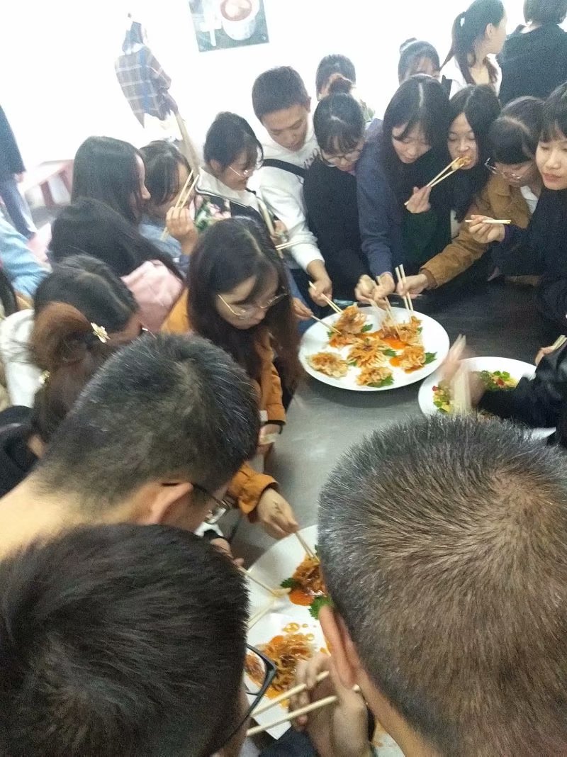 辛宝教授和师生共品美食,四盘菜一扫而光。好吃,好看,聊扎了的赞美声不绝于耳。辛宝教授问学生,赵大师的菜好不好?师生异口同声地说,好!
