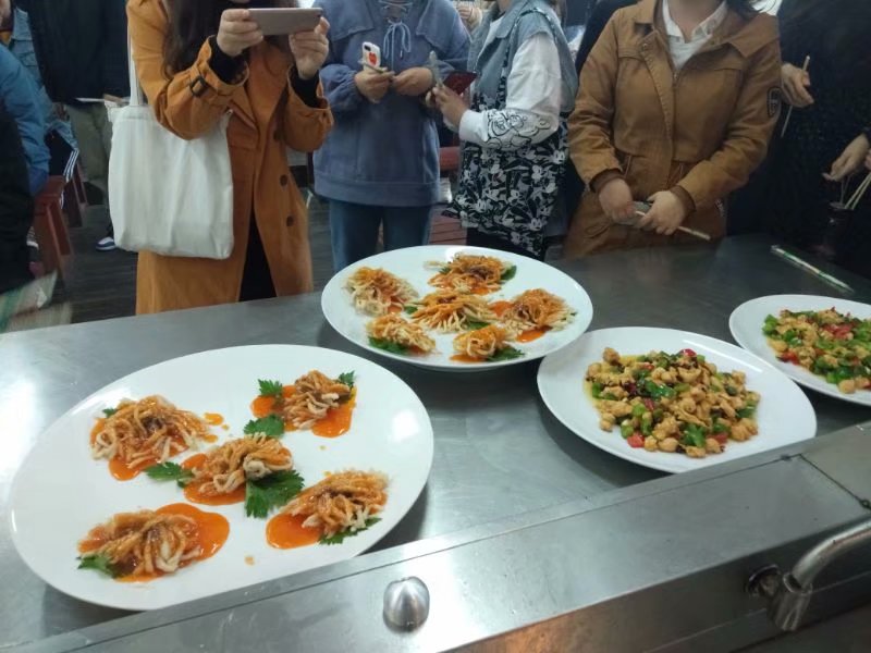 下午四点三十分,应陕西中医药大学辛宝教授的提议,beat365平台官方网站赵军山大师现场为该校师生展示了精美的厨艺,一道菜是辣子鸡丁,一道菜为菊花鱼,经过烹饪工艺平刀、直刀、花刀、挂糊、上酱、过油等技法,使这两道菜尽显工艺之美。辣子鸡丁口味留香,菊花鱼如秋菊绽放,意境之美巧夺天工。使现场师生惊叹不已。