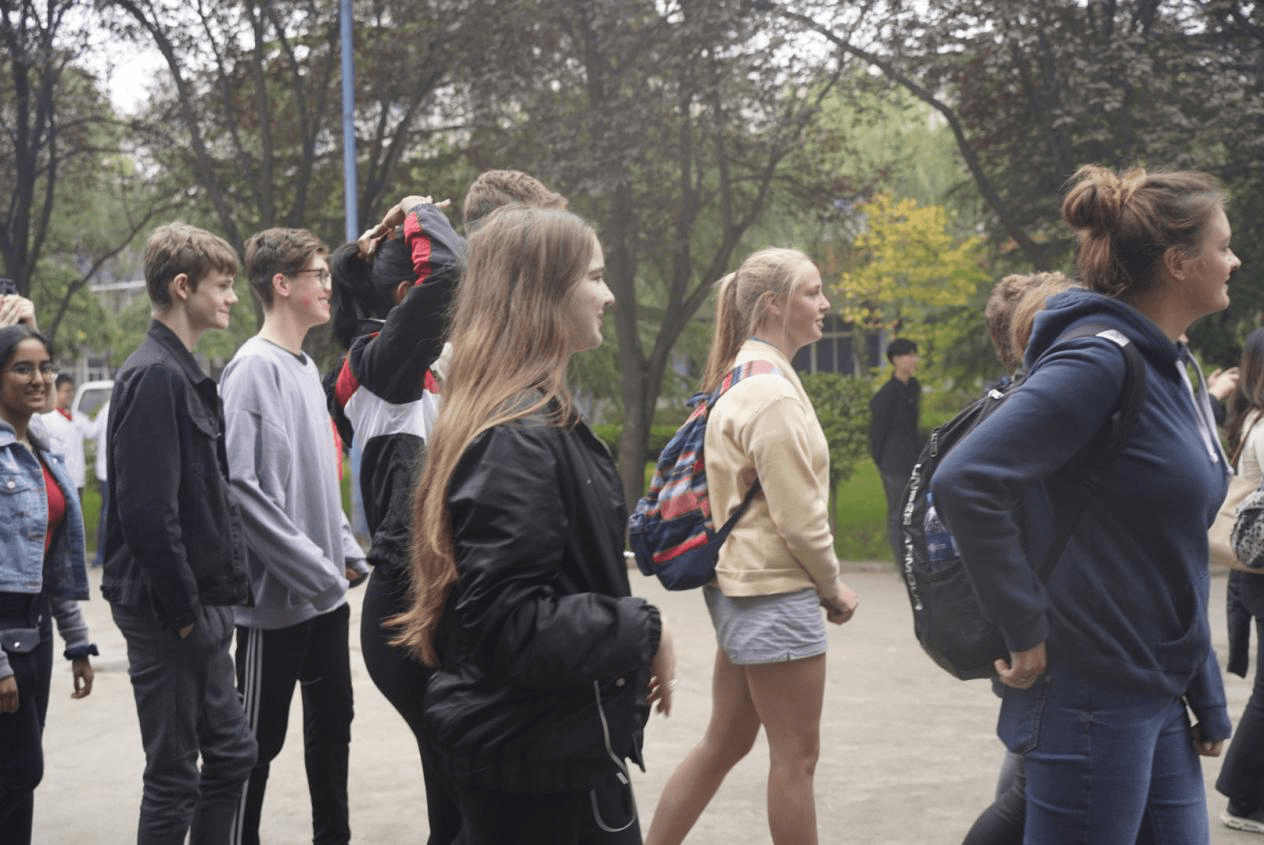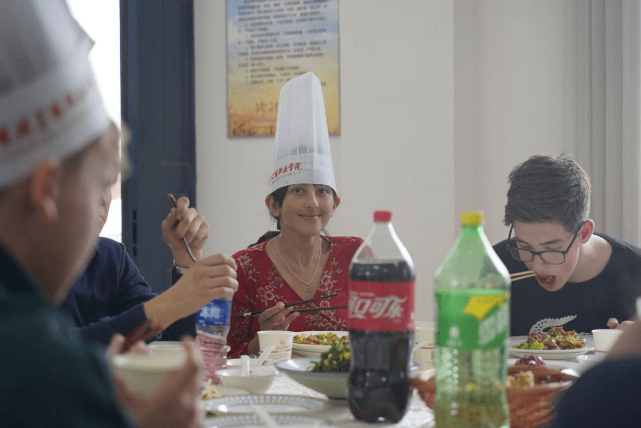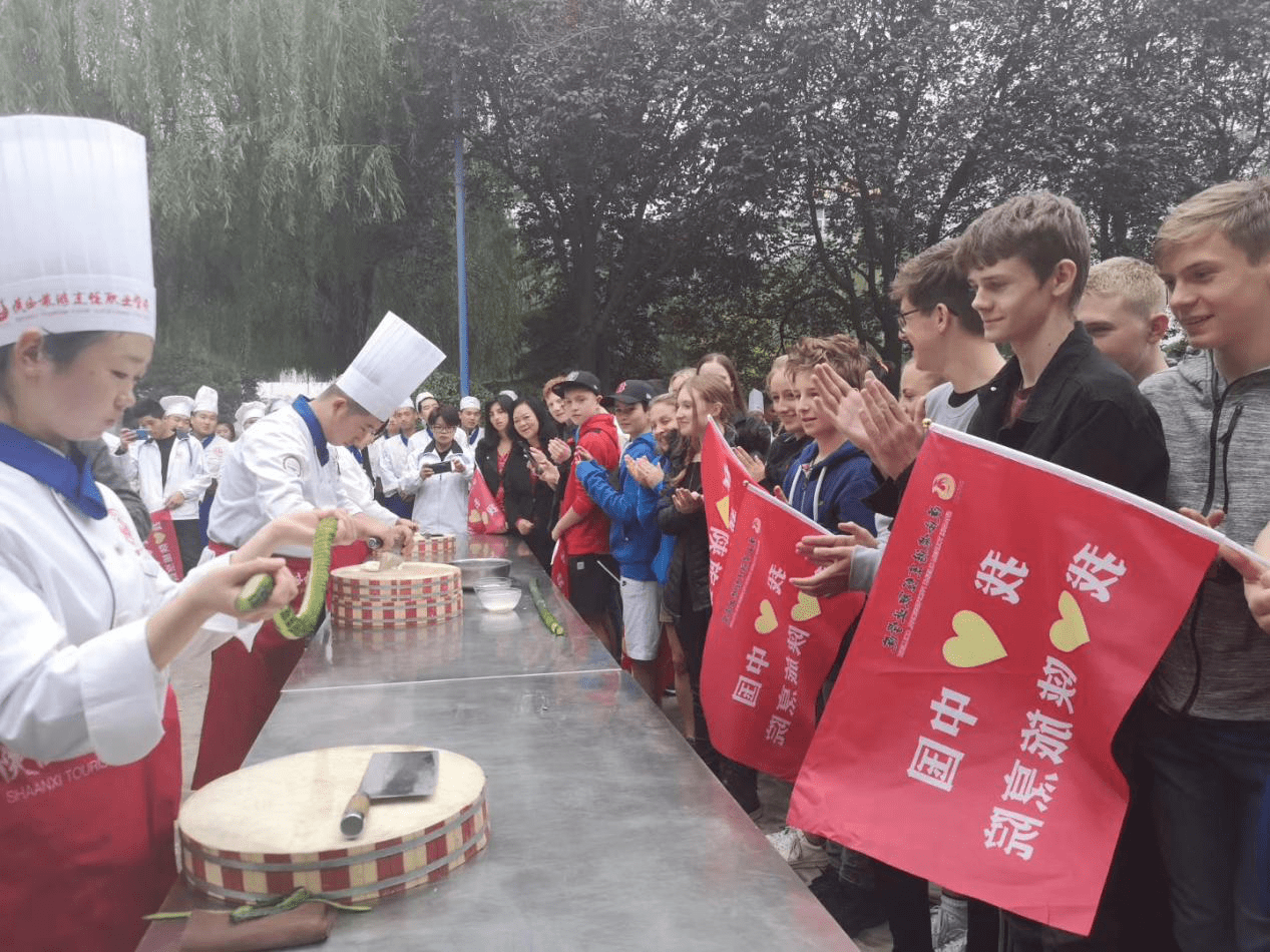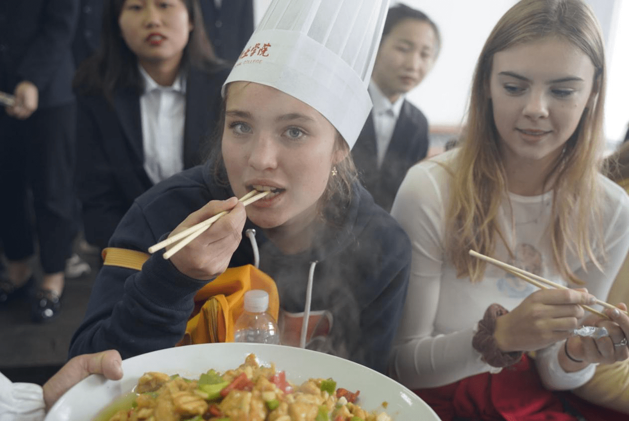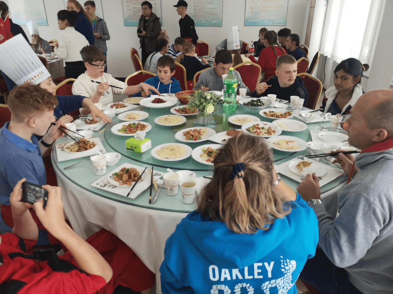 英国学生们手捧自制菜品,穿过美丽的校园,来到该校餐厅,他们在具有中国特色的餐厅就餐,一起品尝中国特色菜肴,感受着博大精深的中国餐饮文化。