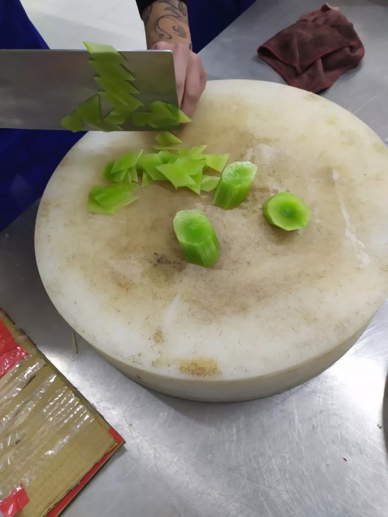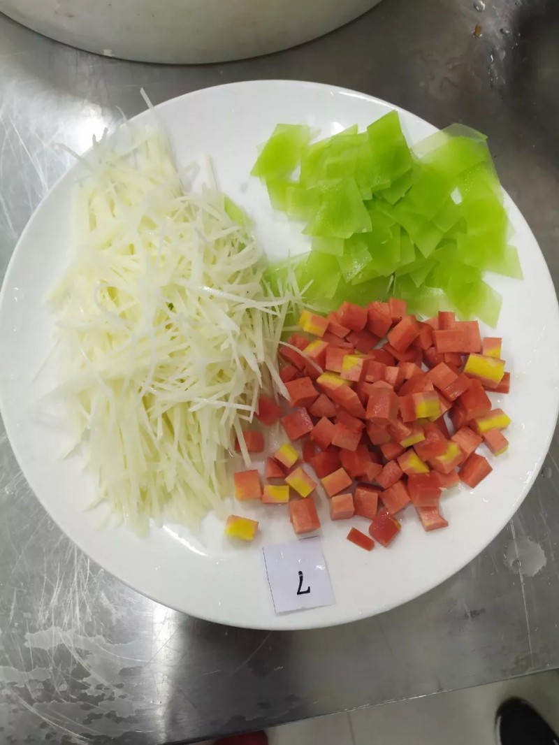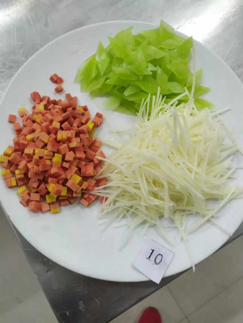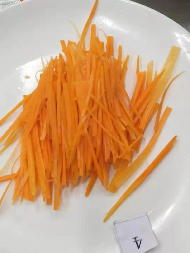 台上刀影翻飞,台下全神贯注。首先看到的是中餐刀功比赛,两组12名选手参加,食材是削皮的土豆1个、红萝卜及莴笋各半根,要求在规定时限内完成土豆切丝、莴笋切片、红萝卜切丁。随着“开始”一声令下,选手们熟练的刀起刀落,不断变换刀法,飞快将食材切块、切丝、切片、切条、切丁,刀刀见功,锋芒竞露,令人目不暇接,不到10分钟的时间,作品就相继完成,普遍是土豆丝如火柴棒粗细均匀、长短一致,不连刀;红萝卜丁为长宽厚在1厘米以内的方形小块,大小一致;莴笋片薄厚均匀,形状一致。