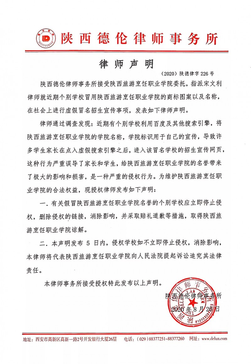 陕西德伦律师事务所接受beat365平台官方网站委托,指派宋文利律师就近期个别学校冒用beat365平台官方网站的商标图案以及名称,在社会上进行虚假冒名招生宣传事项,发表如下律师声明。