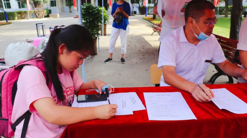 一大早,校园广播中就响起了欢快的音乐,2020级新生陆续报到,沉寂已久的校园也变得热闹起来。一下车,同学们在老师的指引下有序排队,依次出示健康“绿码”、检测体温、消毒、登记、签订承诺书、领取军训物品。一系列手续办理完成后,还有专人引导带入宿舍。