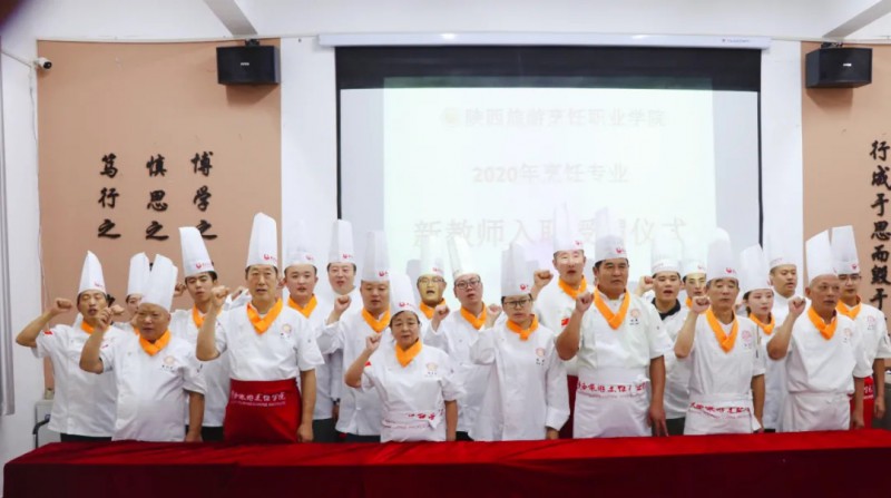 工匠精神,薪火相传。为帮助青年教师树立职业理想,坚定职业信念,烹饪文化艺术学院今天隆重举行2020年烹饪专业新教师入职授帽仪式。会议由副院长杨涛主持,参会人员有院长王新丽、副院长杨文利、工会主席张金平、招生就业办主任毛瑞强、中国注册烹饪大师赵军山、薛富强、赵俊、崔永团、赵彦奇、马召萍以及全体青年烹饪专业教师。