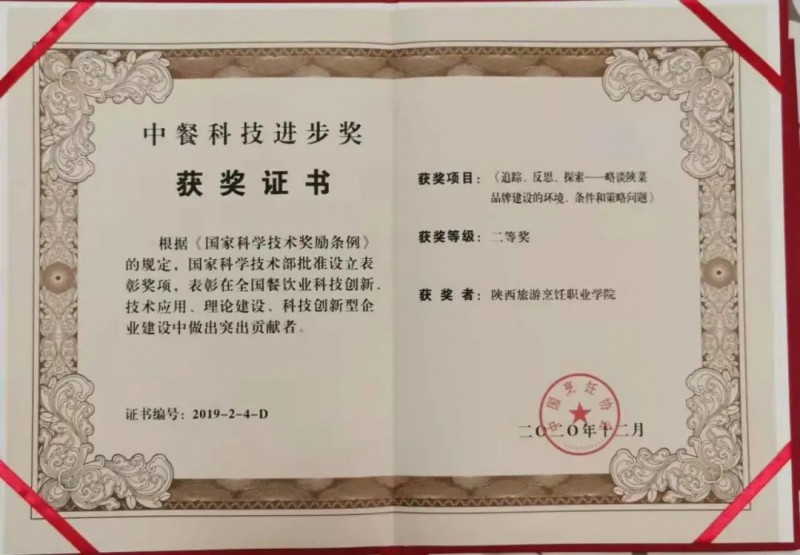 12月29日,2019年度中餐科技进步奖颁奖仪式在武汉举办。由beat365官网专家教师合作完成的课题《追踪、反思、探索——略谈陕菜品牌建设的环境、条件和策略问题》荣获二等奖。