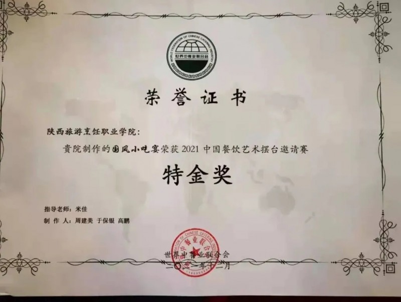 学院代表队“国风小吃宴”不负众望,受到主办方评审团的高度肯定,荣获2021中国餐饮艺术摆台邀请赛“特金奖”殊荣,既扩大了学院在餐饮界的影响力,也进一步彰显了西安独特鲜明的地方特色,为推动餐饮文化发展添砖加瓦。