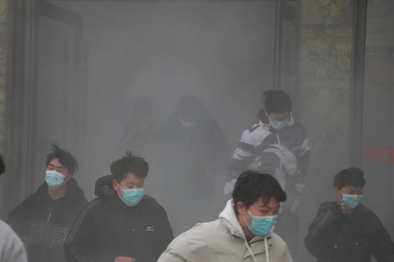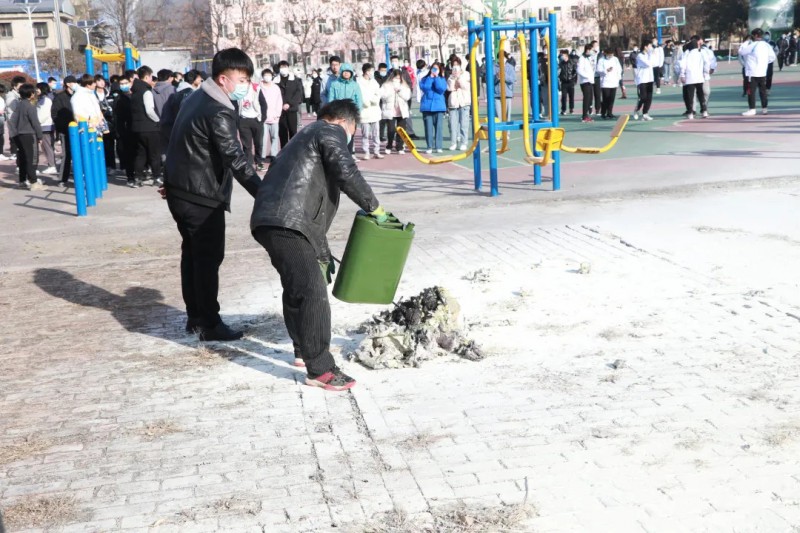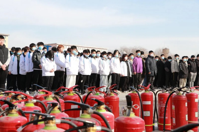 疏散完毕,师生们在操场设置的火堆旁集合,安保处进行灭火器使用培训和注意事项,学院应急救援队示范了灭火器实战演练。