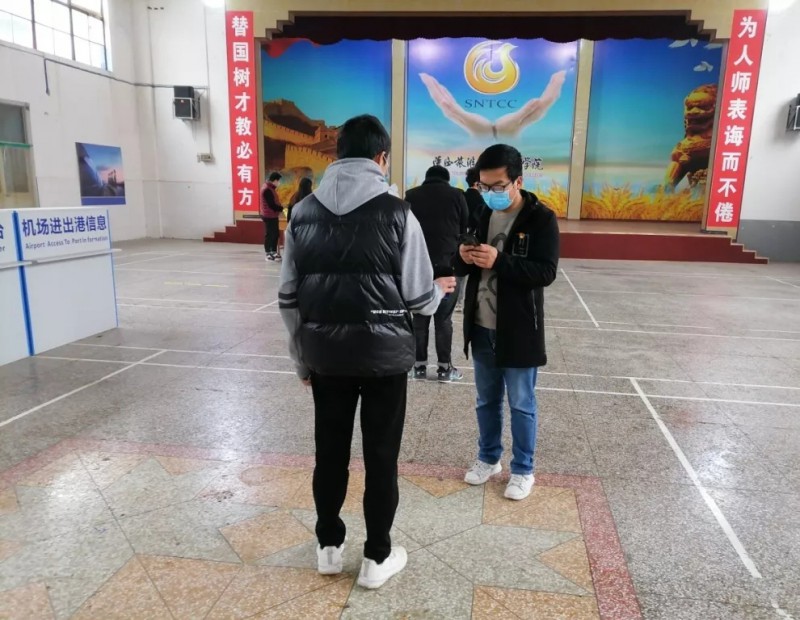 学生党支部副书记毛瑞强同志协助医护人员进行扫码登记。