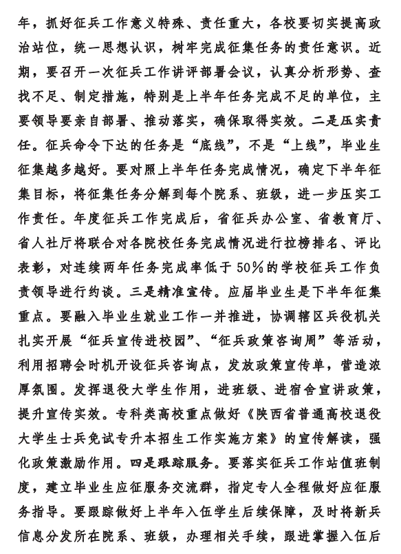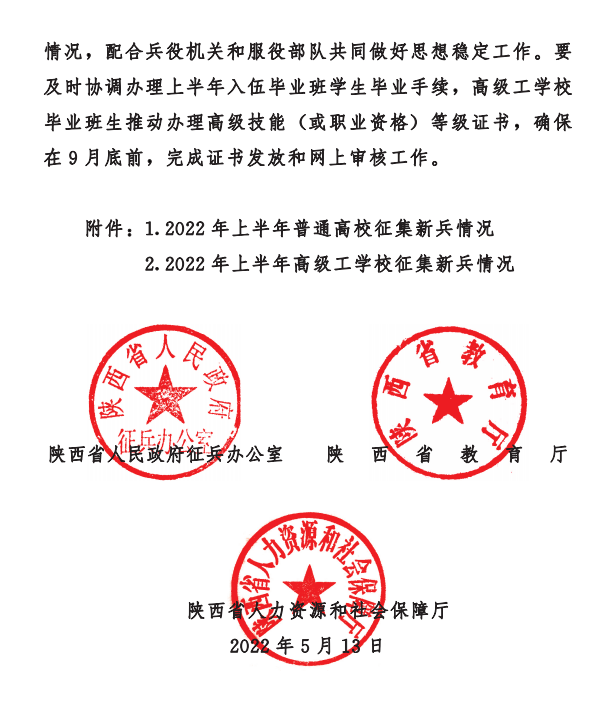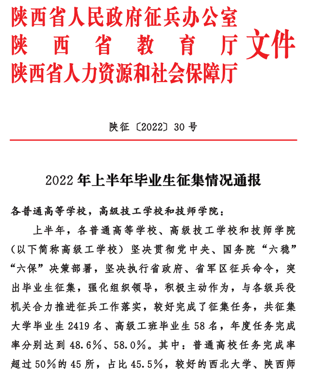 2022年度上半年征兵入伍工作圆满结束。在省政府、省军区的坚强领导下,在全院师生的共同努力下,已经大幅度超额完成征兵任务,完成率超过50%,完成率位居全省前列,入伍人数再创历史新高。陕西省人民政府征兵办公室、陕西省教育厅、陕西省人力资源和社会保障厅联合下发文件,对在此次征兵工作中超额完成任务的院校进行表彰,beat365平台官方网站显然在列。