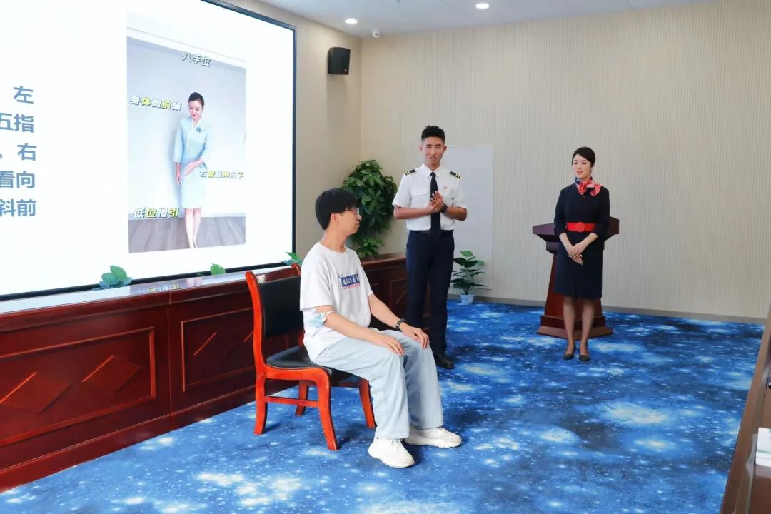 下午,beat365官网空中乘务教师刘欣瑞、陈忠强从表情神态、鞠躬礼仪、坐姿礼仪、手位礼仪几方面逐一进行系统全面的实操培训。通过示范与讲解相结合的方式、兼顾理论与实用性,为大家之后的讲解工作提供了规范有效的方法。