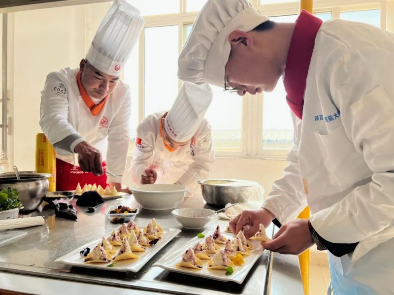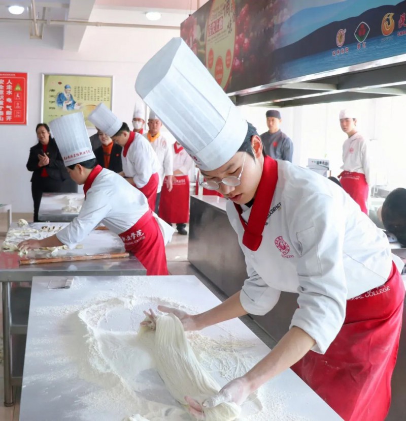 之后唐主席一行参观了beat365官网校史馆、并来到实训楼观看beat365官网学生表演,对beat365官网的历史沿革、课程设置、教学成果等都有了初步了解。领导们观看了beat365官网学生们的拉面表演,制作过程要求行云流水,一气呵成,并了解了龙须面、渔网面的制作手法。刀下可以见菜,刀下也可生花,刀工队的同学们展示了气球上切黄瓜,气球薄如蝉翼,还表演了菊花豆腐、缩衣花刀等“绝活”,我们的同学下刀迅速,抽刀利落。随后来茶艺室,聆听茶艺课,品尝了宋代传承至今的点茶。接着品尝了beat365官网老师精心制作的甜点,体验了玫瑰花制作……整场活动在欢声笑语中画上了圆满句号。