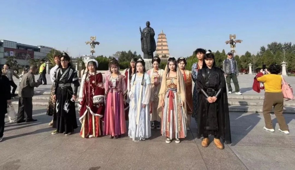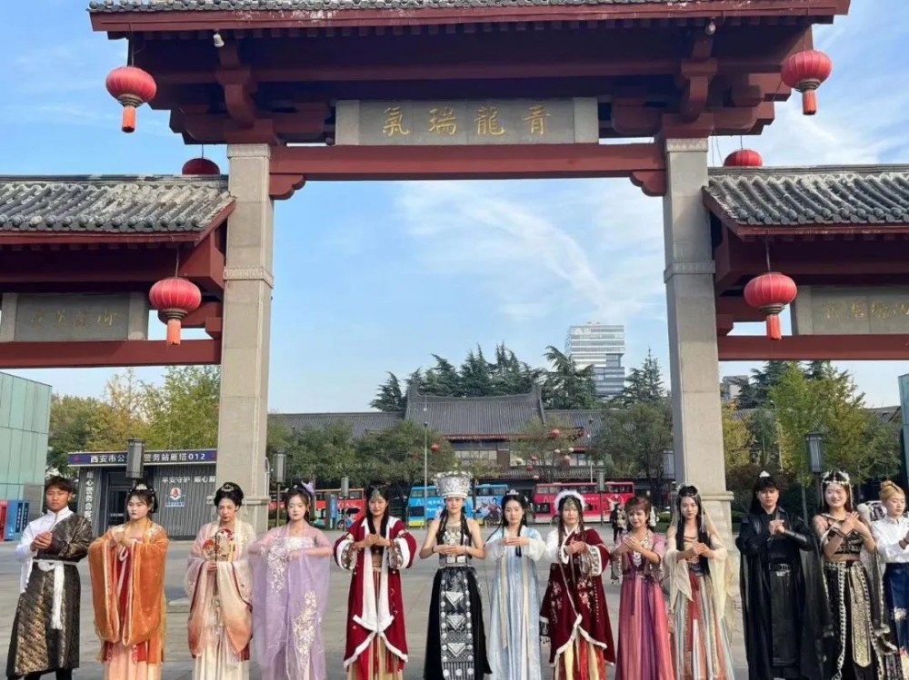 到了目的地,同学们满心欢喜挑选着喜欢的汉服妆造,“理梳篦,点花粉”,体验学习着中华传统文化的魅力与自信。梳妆完成,我们一路走到大雁塔,古丝绸之路的起点,身着汉服漫步在古色古香的红墙下,学习汉文化的汉礼立容和坐容。