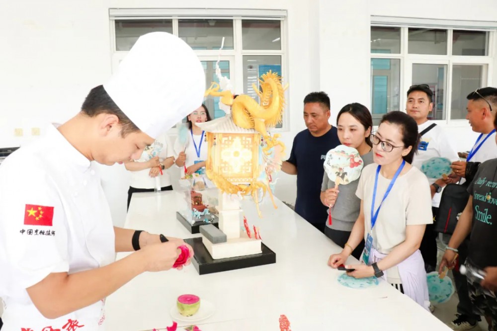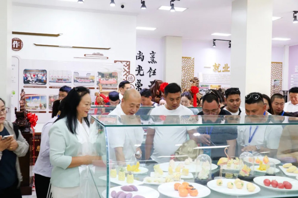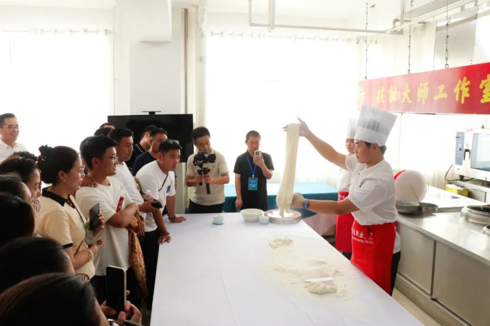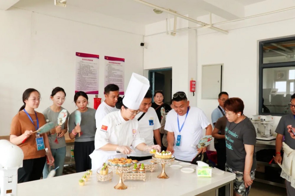 参观期间,烹饪艺术学院师生精心准备了丰富多彩的专业技能展示,包括菊花豆腐、蜈蚣笋、西餐刀具表演、龙须拉面、西点品鉴、唐菓子制作及雕刻技艺等,现场氛围热烈,赢得来访教师的阵阵掌声与称赞。