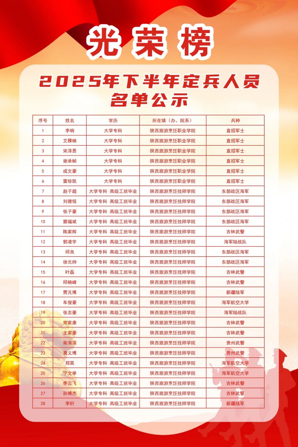 2025年下半年国家征兵工作启动以来,学院优质兵员基地迅速响应号召,广泛动员学院符合参军条件在校大学生入伍,众多有志青年怀揣着对军营的向往踊跃报名。经过层层严格筛选,学院28名优秀青年凭借过硬的综合素质脱颖而出,光荣成为一名即将踏入军营的新兵。
