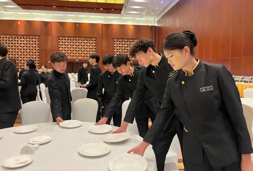 抵达国家会议中心后,19名学子凭借扎实的专业素养,被精准分配到前厅、运营部、酒吧等关键岗位,迅速开启实战考验。在前厅服务岗位,学子们化身温暖的 “引导者”,始终保持微笑,耐心为每一位嘉宾指引入场路线,细致解答各类疑问,将周到的接待礼仪融入每一个服务细节,让嘉宾在初到之时便感受到贴心与温暖。