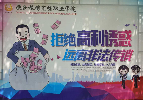 二、营造专项整治工作氛围。学院在教学楼前,学生公寓等处,通过张贴宣传画报、悬挂打击传销宣传条幅、发送反传销宣传短信等多种方式,宣传打击传销违法行为的意义,引导学生自觉抵制传销。在校园内形成良好的打击传销社会氛围,进一步提高广大学生对传销本质及危害的认识。在新生入学之后,通过第一次班会,要求各辅导员向新生宣传传销的危害性,特别是通过讲析传销的各种手段、方式,提高学生识别、提防传销,增强警觉性。同时号召全体学生,积极向学校、公安、工商机关举报涉嫌传销的行为、线索,积极参与、配合各项打击非法传销的正义斗争,主动维护校园和谐稳定,共同创建无传销和谐校园。