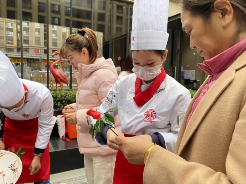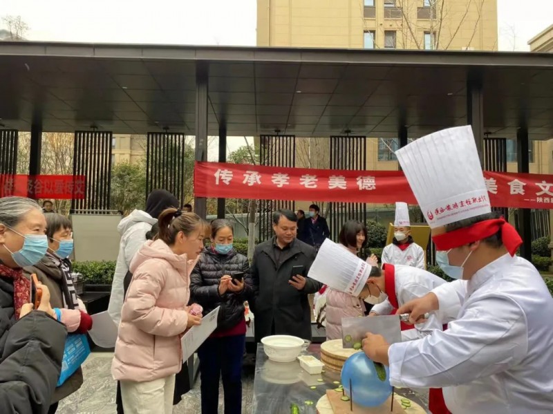活动中,社区老人一同欣赏了师生们在气球上切黄瓜、菊花豆腐、渔网萝卜、面塑、画盘、雕刻及龙须拉面等专业技能展示,一番操作后,气球完好如初,黄瓜神似蜈蚣,菊花豆腐栩栩如生,龙须拉面细如发丝,频频吸引路人的眼球,现场观众纷纷拍手叫好,民众们也按捺不住,积极参与其中,在接连不断地欢声笑语中感受到了烹饪带来的幸福感和满足感。