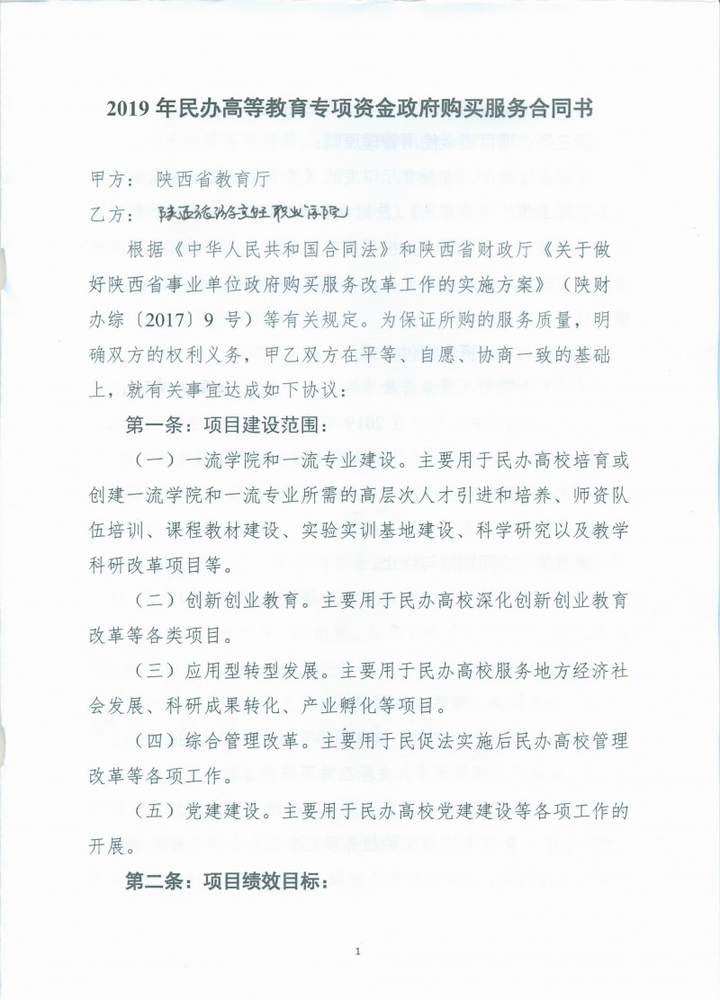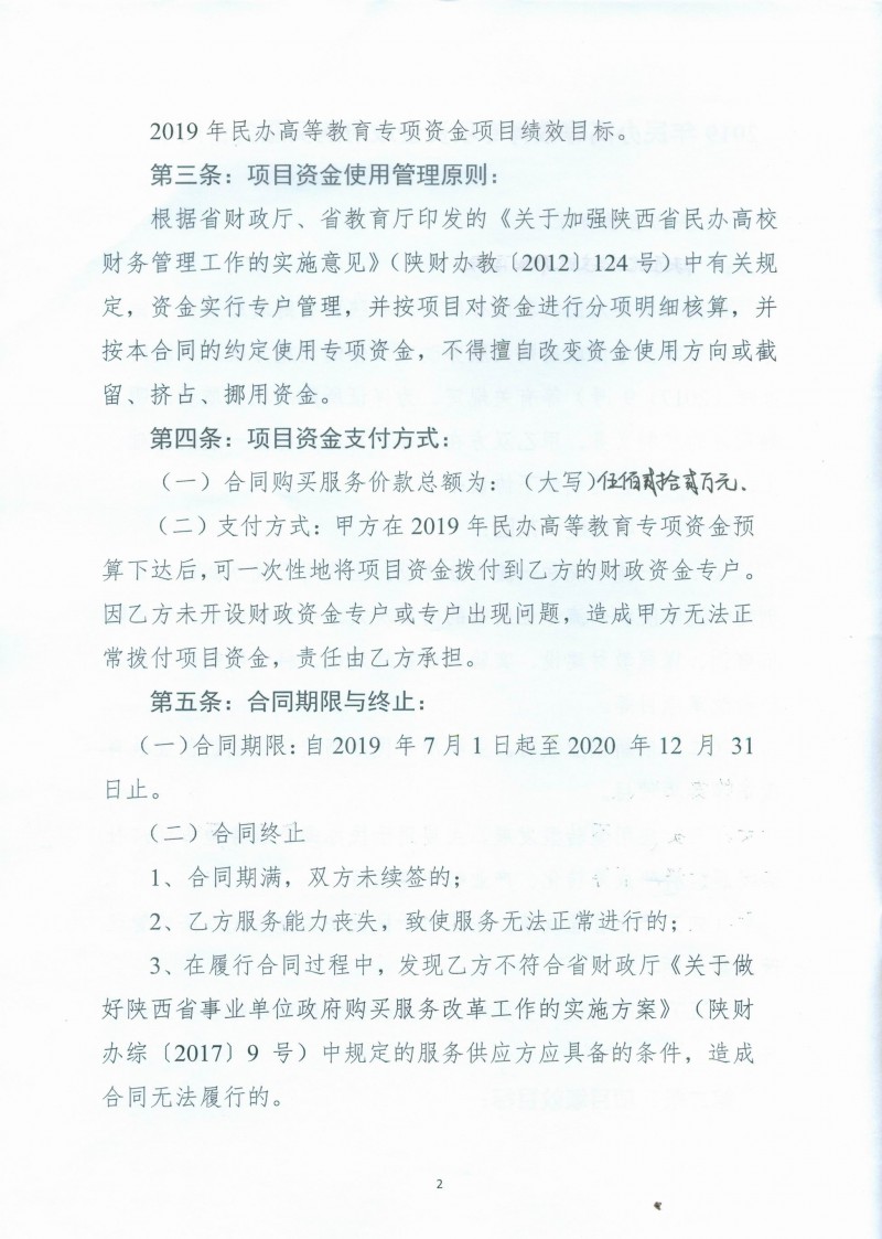 2019年陕西省民办高等教育发展专项资金政府购买服务合同书