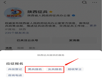 公众号通过子菜单栏目“应征报名”▼“男兵报名”“女兵报名”